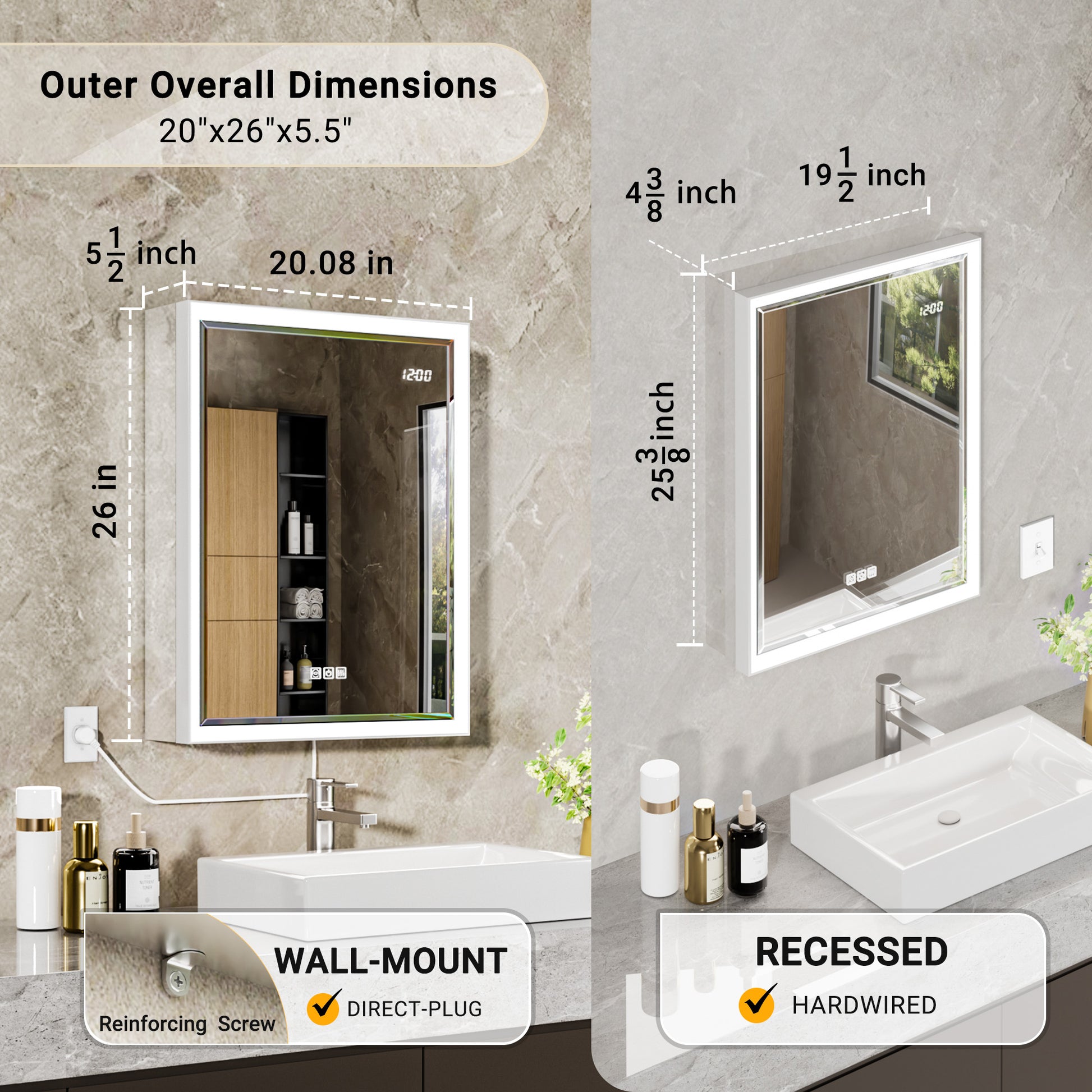 Designed with a right-side hinge, this upgraded beveled LED cabinet combines focused, glare-free lighting with a sculpted mirror edge for elevated refinement. The advanced diffusion panel maximizes brightness while reducing power consumption. A press-to-open design reveals interior mirror panels with a 95° opening angle, motion-sensor ceiling lighting, adjustable shelving, and a low-voltage charging socket.