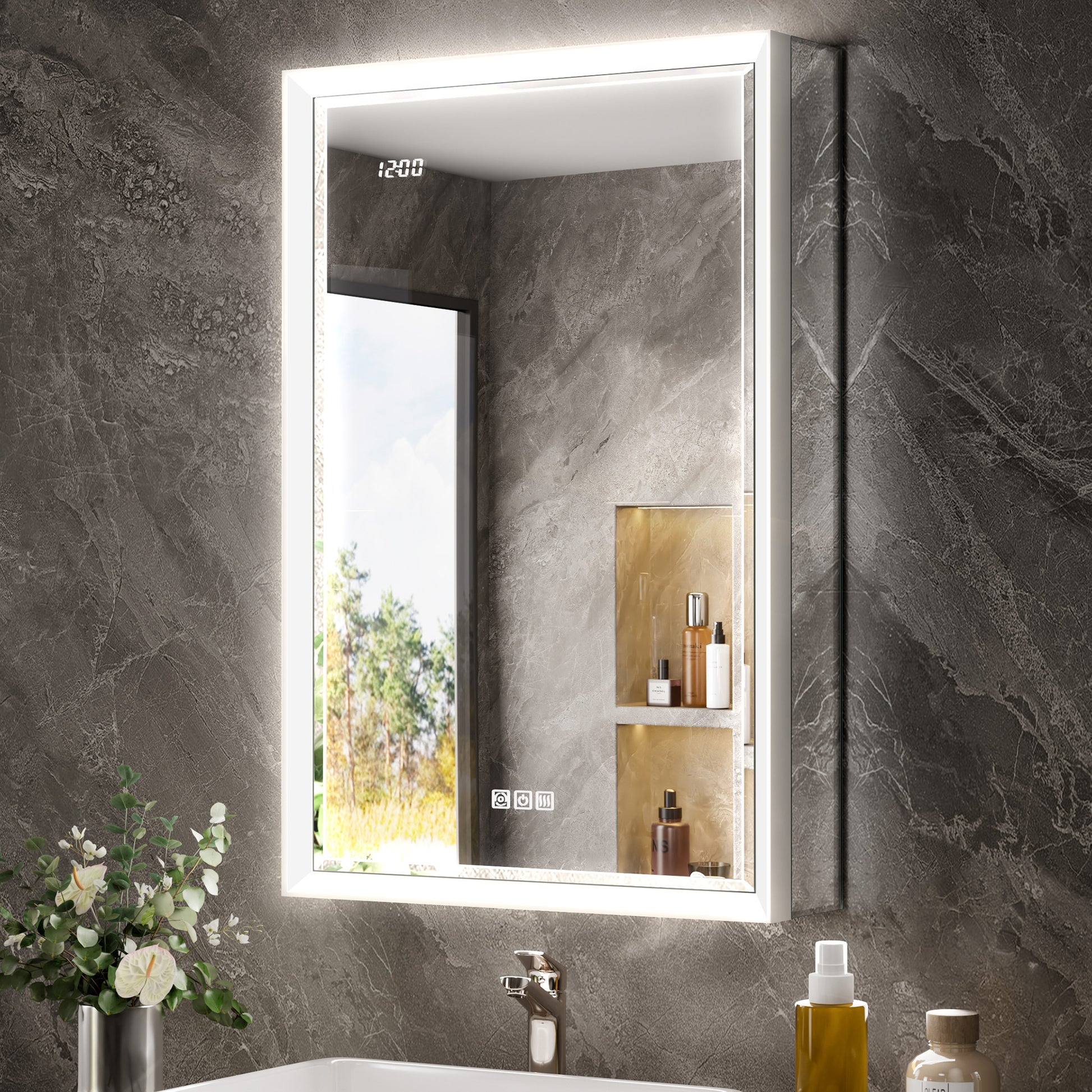 This upgraded Elega model features inwardly beveled LED light strips that focus brightness without direct glare, paired with beveled mirror edges for a refined architectural look. The high-transmittance diffusion panel delivers brighter, shadow-free illumination with lower energy consumption. A gentle press opens the left-hinged door to reveal interior mirrors with a 95° opening angle, motion-sensor ceiling lighting, adjustable glass shelves, and a low-voltage charging socket.