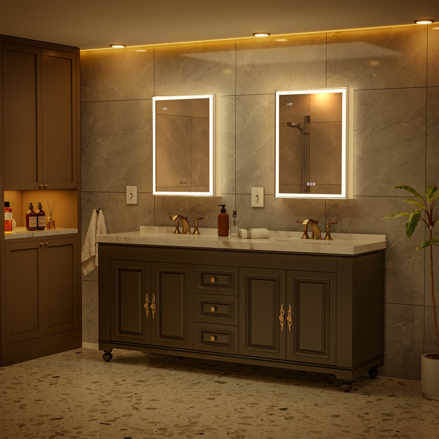 Smart touch controls allow precise adjustment from 10–100% brightness and 3000K–6000K color temperature, with memory function, built-in defogger (1-hour auto shut-off), and 12/24-hour time display for everyday convenience.
