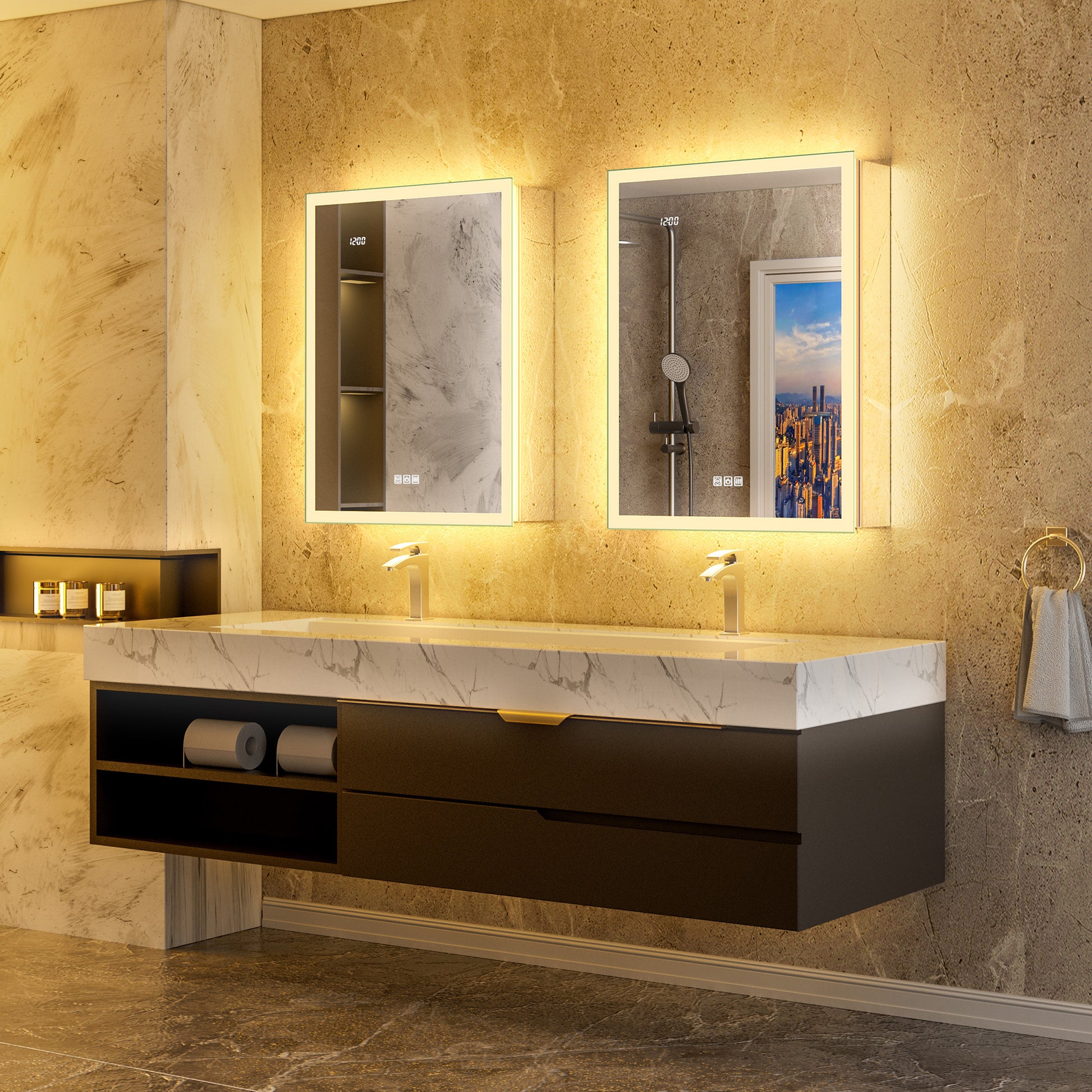 Designed with an innovative bevel-cut edge and high-transmittance acrylic diffusers, this mirror cabinet delivers both front-facing task lighting and a soft ambient back glow.